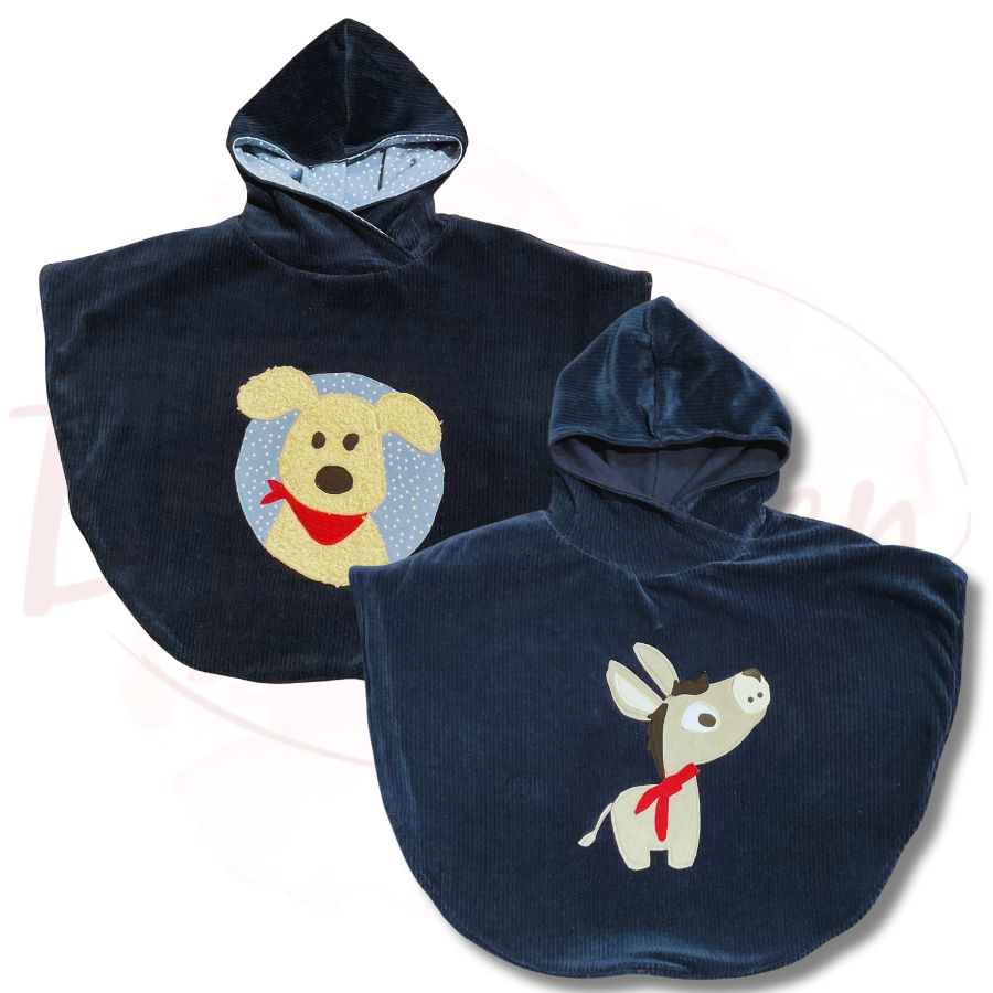 Lassen Sie sich von dem kuscheligen, warmen und weichen Gefühl unseres "Kinder Poncho" Größe 86-104 Babycord in blau begeistern. Dieser liebevoll gefertigte Poncho mit süßen Applikationen ist das perfekte Accessoire für Ihre Babys und Kleinkinder, das nicht nur schön aussieht, sondern auch wunderbar wärmt.